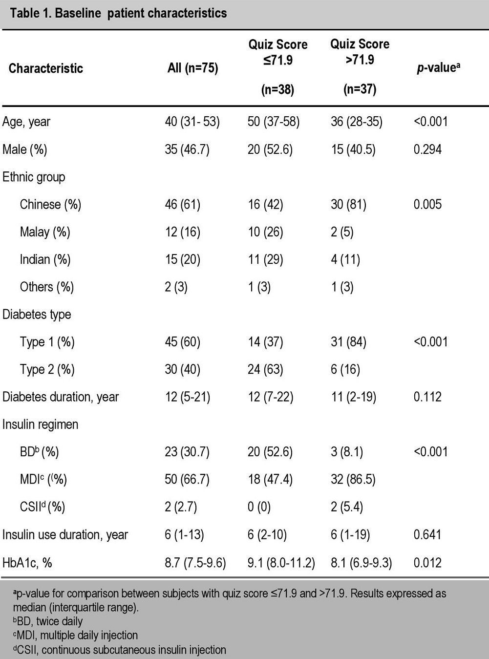 We used the median of 71.9% as a cut-off to divide the group into higher and lower quiz scores. Subjects who were younger, with type 1 DM, on more complex insulin regimens and with lower HbA1c scored better on the quiz. No significant difference was found between the two groups in terms of gender, duration of diabetes or duration of insulin use (Table 1).