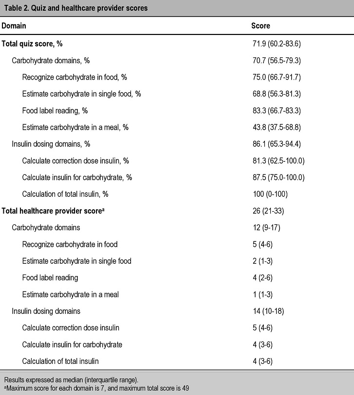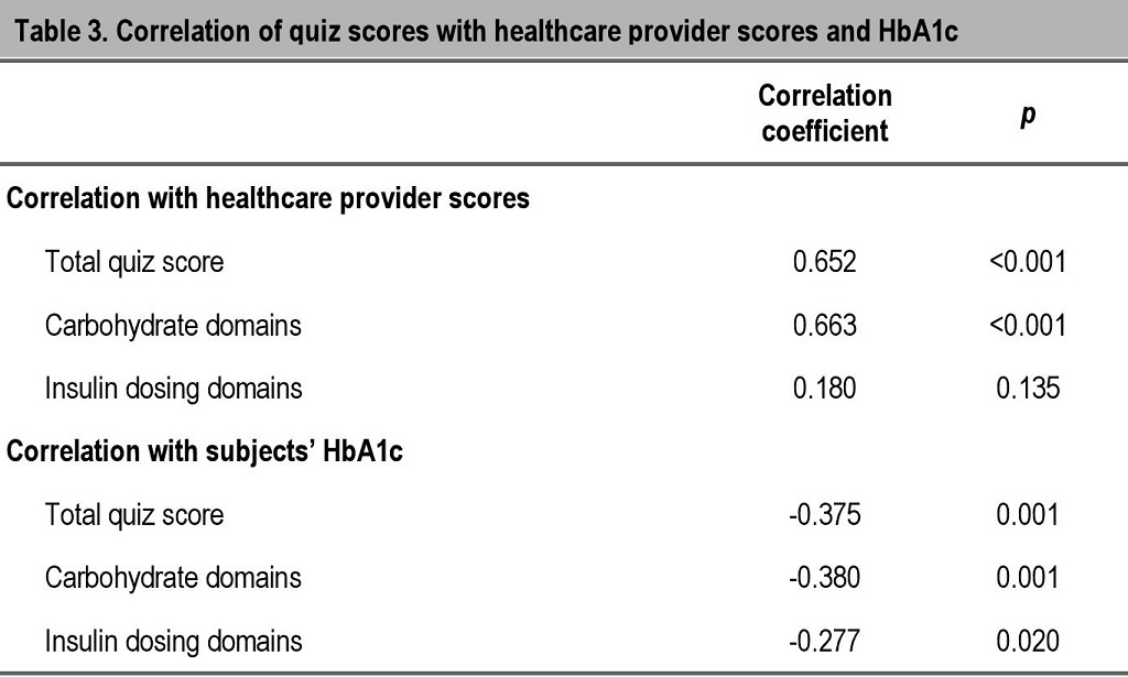 There was a significant, albeit weak to moderate negative correlation of the total quiz,, carbohydrate domain and insulin dosing domain scores with the subjects' HbA1c. Similarly, the total quiz and carbohydrate domain scores had strong and significant positive correlation with the healthcare provider assessments, which was not observed in the insulin dosing domain (Table 3).