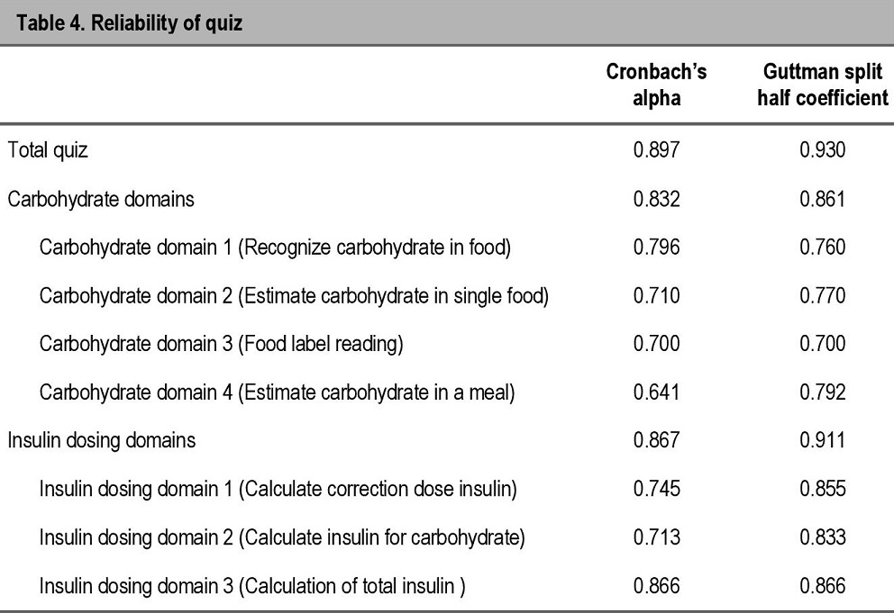 Conclusions. Our analysis suggested that this newly developed quiz had good reliability and validity for testing carbohydrate and insulin dosing knowledge in a group of Asian subjects with diabetes mellitus. This can be a useful screening tool in clinical practice.
