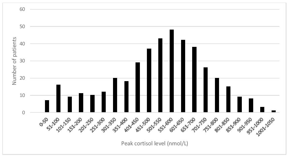 Appendix 1. Peak cortisol levels in low dose short synacthen tests in 423 in-patients.