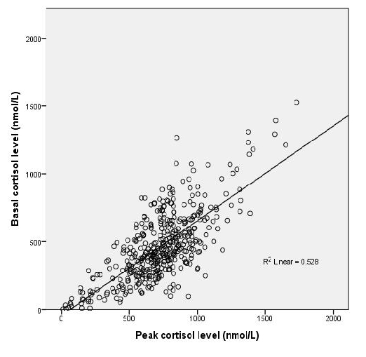 Figure 1.Individual cortisol peak levels in 423 in-patients plotted against basal cortisol during low dose short Synacthen® test.