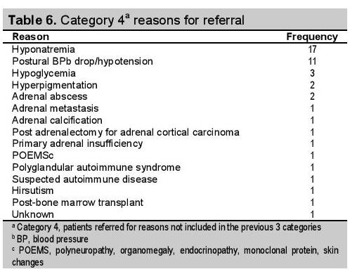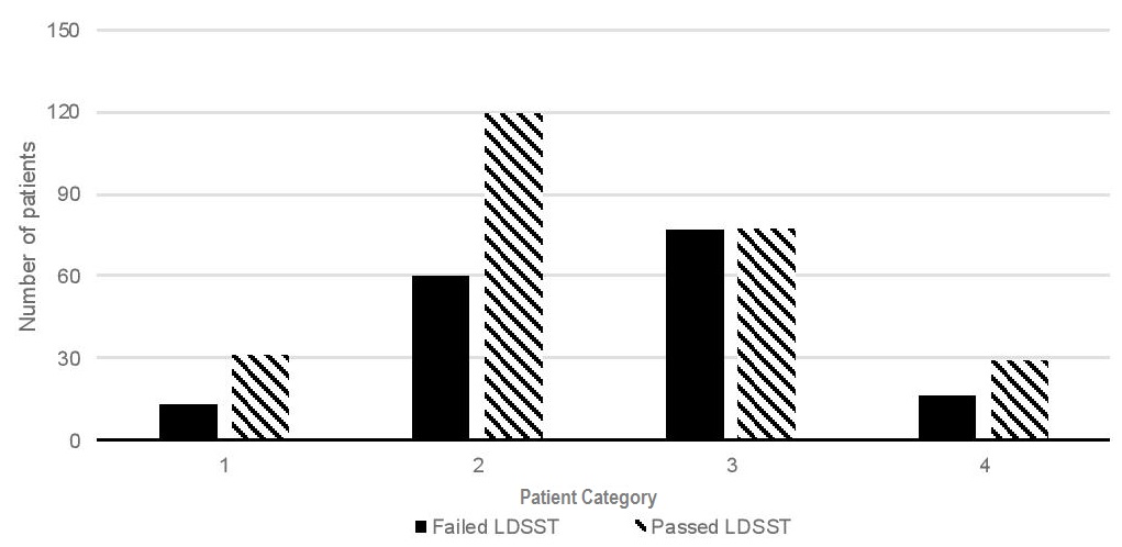Fifteen percent of the in-patients failed the LDSST. For the out-patients, the percentage of patients failing the LDSST were similar for categories 1, 2 and 4 (30 to 36%). Remarkably, 50% of those in category 3 failed the LDSST. Chronic adrenal suppression, either by exogenous steroid or excessive endogenous steroid from a functioning adrenal adenoma, made them more prone to genuine adrenal insufficiency.