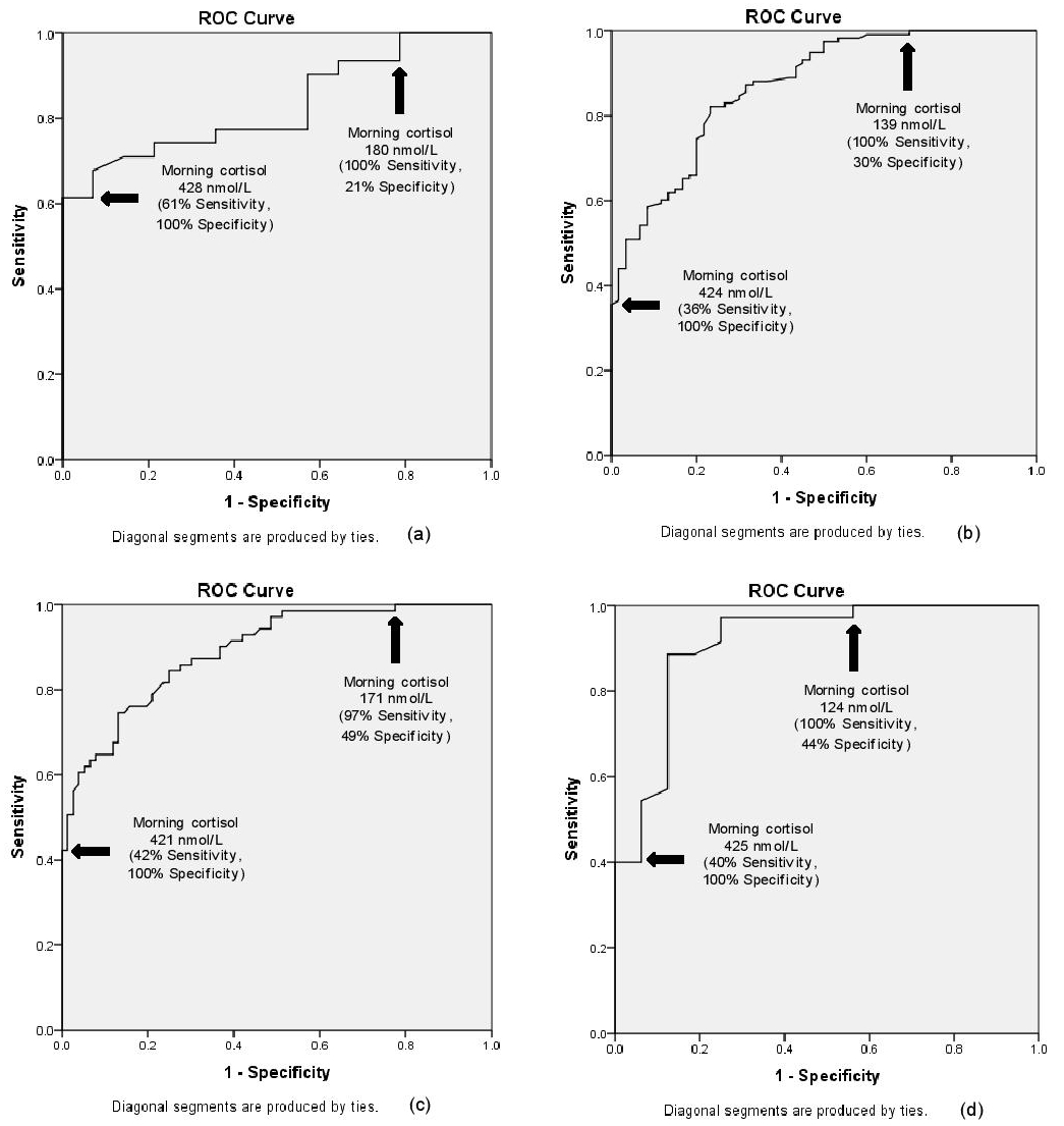 Figure 4.Receiver operating characteristic curves of morning cortisol levels in 422 out-patients with the low dose short Synacthen® test (LDSST) as reference test. Peak cortisol levels in the LDSST less than 500 nmol/L indicate adrenal insufficiency. (a) Category 1: In-patients reffered upon discharge, excluding those in categories 2 and 3; area under the curve (AUC) 0.828 (95% confidence intervals 0.711-0.945). (b) Category 2: Patients with pituitary lesion/disturbance; AUC 0.869 (95% confidence intervals 0.817-0.922). (c) Category 3: Patients who were on exogenous steroid or had adrenalectomy done due to adrenal Cushing's syndrome; AUC 0.879 (95% confidence intervals 0.824-0.933). (d) Category 4: Patients referred for other reasons; AUC 0.913 (95% confidence intervals 0.820-1.000).