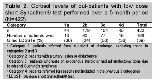 Table 2. Cortisol levels of out-patients with low dose short Synathen® test performed over a 5-month period (N=422)