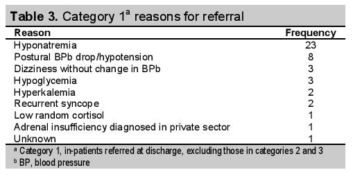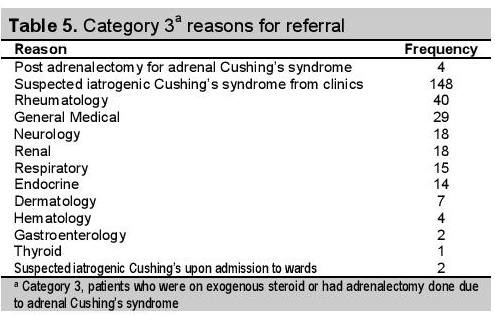 Results. For in-patients admitted for acute illness, a spot serum cortisol of ≤92 nmol/L indicated adrenal insufficiency, and a value of ≥494 nmol/L signaled adequate adrenal reserve. The respective morning cortisol values for out-patients who were ambulatory and not under stress were ≤124 nmol/L and ≥428 nmol/L. The percentage of unnecessary LDSST was higher in the in-patient cohort than the out-patient cohort (43% and 37%, respectively). The most common referral for out-patient LDSST was for suspected iatrogenic Cushing's syndrome (ie: iatrogenic adrenal suppression) from Rheumatology.