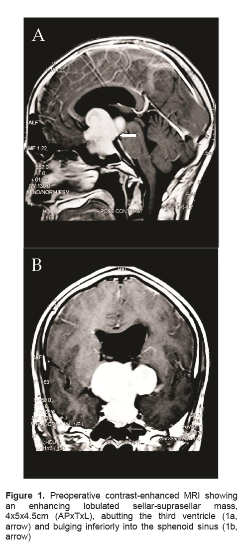 Figure 1. Preoperative contrast-enhanced MRI showing an enhancing lobulated sellar-suprasellar mass, 4x5x4.5cm (APxTxL), abutting the third ventricle (1a, arrow) and bulging inferiorly into the sphenoid sinus (1b, arrow)