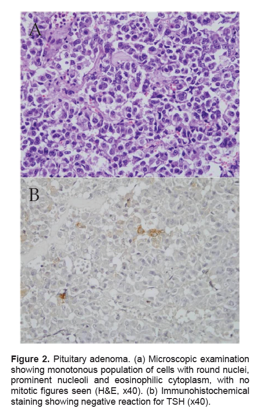 Figure 2. Pituitary adenoma. (a) Microscopic examination showing monotonous population of cells with round nuclei, prominent nucleoli and eosinophilic cytoplasm, with no mitotic figures seen (H&E, x40). (b) Immunohistochemical staining showing negative reaction for TSH (x40).