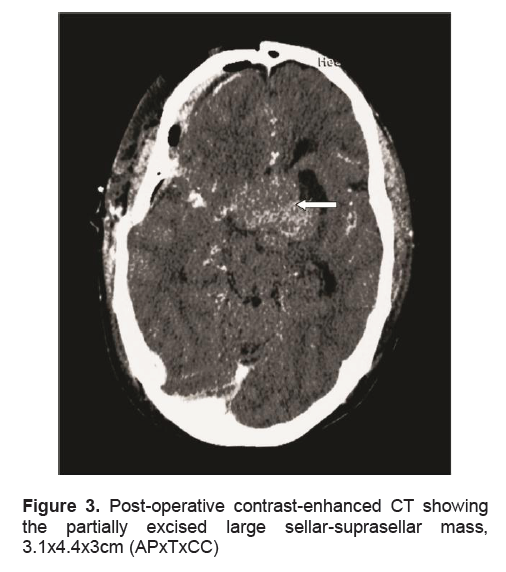 Figure 3. Post-operative contrast-enhanced CT showing the partially excised large sellar-suprasellar mass, 3.1x4.4x3cm (APxTxCC)