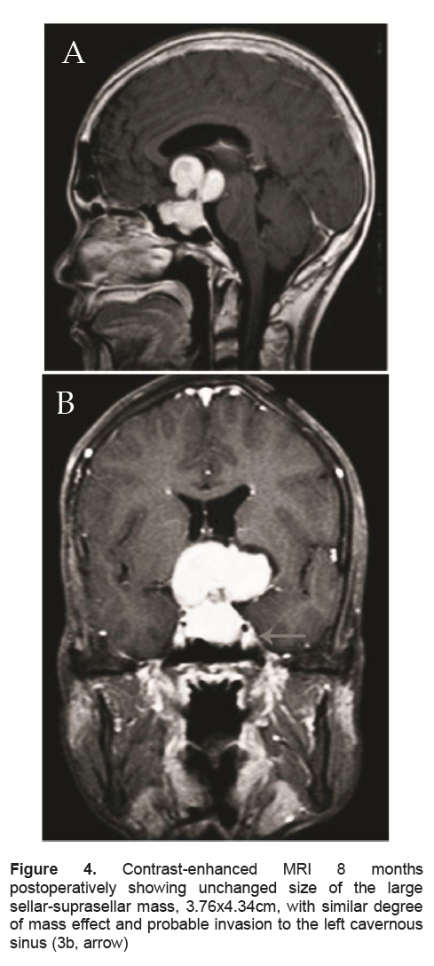 Figure 4. Contrast-enhanced MRI 8 months postoperatively showing unchanged size of the large sellar-suprasellar mass, 3.76x4.34cm, with similar degree of mass effect and probable invasion to the left cavernous sinus (3b, arrow)