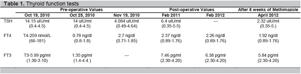 Clinical examination revealed an ectomorphic male with diffuse enlargement of the thyroid gland but with no signs and symptoms of hyperthyroidism.. Vital signs revealed a BP: 120/70 mm Hg, HR: 72 bpm, RR: 16 cpm and BMI: 16.99kg/m2. Further endocrine work-ups revealed an inadequate adrenal reserve (Table 2); hence, he was started on Prednisone. The TSH, FT3 and FT4 were still elevated 6 weeks post-operatively (Table 1).