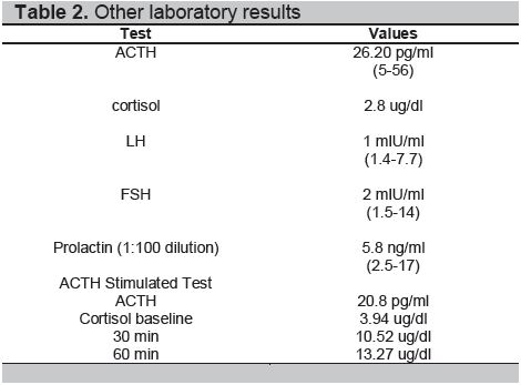 A 38-year-old male presented in another institution because of generalized seizure lasting for 2 minutes. A week prior to the event, the patient complained of generalized weakness, fatigue, anorexia, nausea and vomiting. For the past 5 years, he claimed intermittent episodes of frontal headaches which were later associated with blurring of vision especially at the right lateral area 2 years ago. At the emergency room, the patient was initially man aged as a case of adrenal insufficiency. Precluding hormonal studies, an imaging study was done. Magnetic Resonance Imaging (MRI) of the pituitary revealed a 4.0 x 5.0 x 4.5 cm sellar-suprasellar mass (Figure 1). Cortisol was low at 2.8ug/dl. ACTH was inappropriately normal for a low cortisol. Prolactin was within normal (Table 2). Thyroid function tests revealed elevated total hormones and elevated TSH, but repeat testing using free hormones revealed a low normal FT4 (free T4), a slightly low FT3 (free T3) and still an inappropriately elevated TSH (Table 1). Other hormonal work-ups concluded hypogonadotropic hypogonadism (Table 2). Visual field studies revealed bilateral hemianopsia. Patient was started on steroids (prednisone) and anti-seizure medication (levetiracetam). The symptoms of generalized weakness, fatigue, anorexia, nausea and vomiting resolved immediately after initiating the steroids. This confirmed concluded the diagnosis of adrenal insufficiency secondary to hypopituitarism secondary to a pituitary macroadenoma. The seizure did not recur. A repeat thyroid function test was done a month later which revealed a high normal TSH and an elevated FT4 (Table 1). However, these derangements pointing to a probable central hyperthyroidism were not taken into consideration. Patient eventually underwent craniotomy with excision of the tumor with an aggregate measurement of 3.0 x 2.5 x 0.5cm and a pathological diagnosis of a pituitary adenoma (Figure 2a). Further excision was not possible because its consistency was firm to harn and further excision could further damage some vital tissues. Perioperative course was uneventful. Post-operative CT-scan revealed a residual mass measuring 3.1 x 4.4 x 3.0 cm (Figure 3). Succeeding follow-ups were done in our institution. Patient denied recurrence of the initial symptoms except for the blurring of vision at the right lateral area, although he claimed improvement.