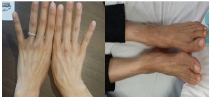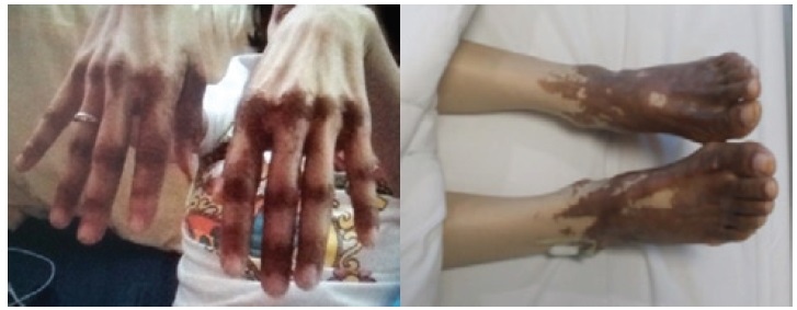 Click here to download Figure 1Figure 1.Hyperpigmented plaques with velvety surface on dorsum of both hands and feet (photographs taken before treatment).