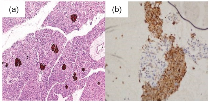 Figure 2.Immunohistochemical stain (Chromogranin H&E, x 100) A. Islands of Langerhans B. Liver Mass.