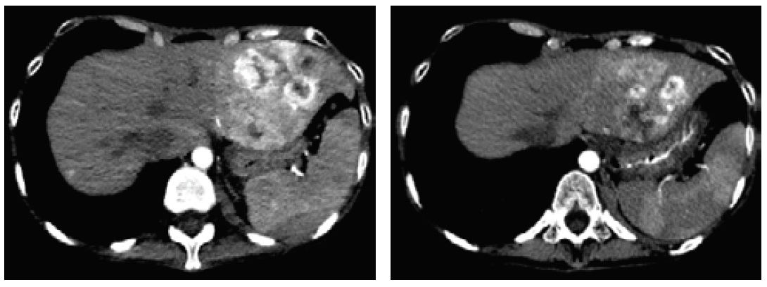Figure 4. Decreased size of the inhomogenous mass in the left hepatic lobe.