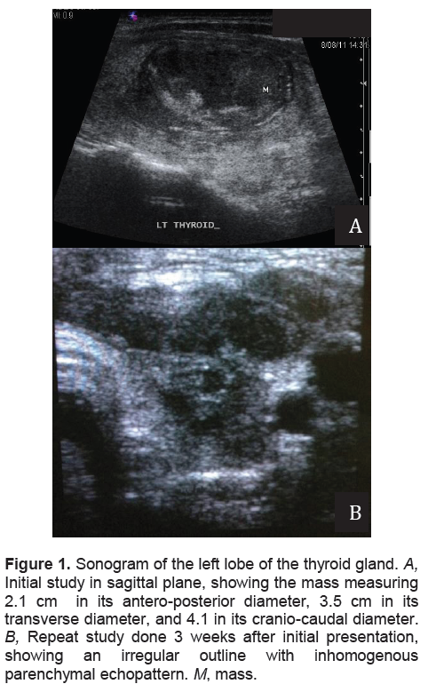 Figure 1. Sonogram of the left lobe of the thyroid gland. A, Initial study in sagittal plane, showing the mass measuring 2.1 cm in its antero-posterior diameter, 3.5 cm in its transverse diameter, and 4.1 in its cranio-caudal diameter. B, Repeat study done 3 weeks after initial presentation, showing an irregular outline with inhomogenous parenchymal echopattern. M, mass.