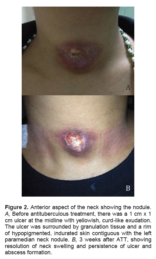 Figure 2. Anterior aspect of the neck showing the nodule. A, Before antituberculous treatment, there was a 1 cm x 1 cm ulcer at the midline with yellowish, curd-like exudation. The ulcer was surrounded by granulation tissue and a rim of hypopigmented, indurated skin contiguous with the left paramedian neck nodule. B, 3 weeks after ATT, showing resolution of neck swelling and persistence of ulcer and abscess formation.