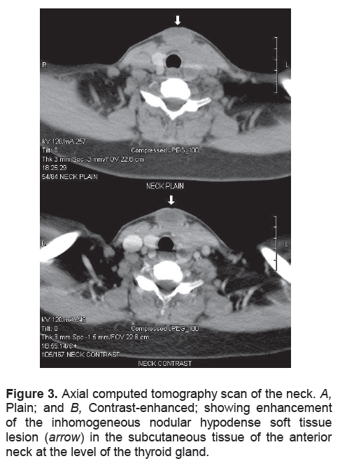Figure 3. Axial computed tomography scan of the neck. A, Plain; and B, Contrast-enhanced; showing enhancement of the inhomogeneous nodular hypodense soft tissue lesion (arrow) in the subcutaneous tissue of the anterior neck at the level of the thyroid gland.