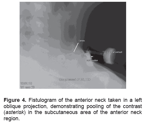 Figure 4. Fistulogram of the anterior neck taken in a left oblique projection, demonstrating pooling of the contrast (asterisk) in the subcutaneous area of the anterior neck region.