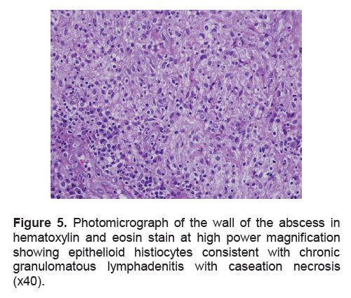 Figure 5. Photomicrograph of the wall of the abscess in hematoxylin and eosin stain at high power magnification showing epithelioid histiocytes consistent with chronic granulomatous lymphadenitis with caseation necrosis (x40).