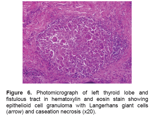 Figure 6. Photomicrograph of left thyroid lobe and fistulous tract in hematoxylin and eosin stain showing epithelioid cell granuloma with Langerhans giant cells ( arrow) and caseation necrosis (x20).
