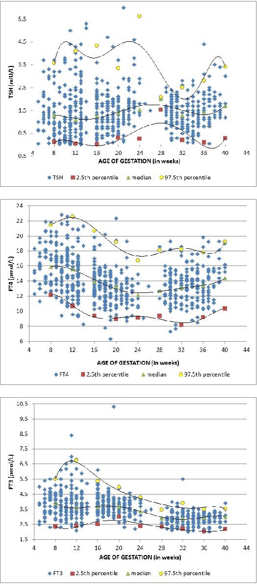 Table 1 shows the trimester-specific reference intervals and median values for TSH, FT4 and FT3 based on data from 595 subjects included in the study. The median, 2.5th and 97.5th percentile plots are shown in Figure 1.