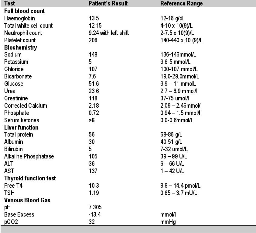 Capillary blood glucose was "High." Urine dipstick was positive with glucose and 3+ ketones. Venous blood gas confirmed metabolic acidosis (Table 1). She was diagnosed with DKA and treated with prompt hydration and intravenous insulin infusion. She received 3 litres of normal saline within the first 2 hours which resulted in normalisation of her blood pressure and heart rate. She received another 3 litres of intravenous fluids over the next 24 hours. She was given an initial intravenous bolus dose of 0.1unit/kg of regular insulin followed by 0.1 unit/kg/hour of insulin. The insulin rate was subsequently titrated according to the capillary glucose. Antibiotics were initiated for suspected sepsis but further tests showed that there was no evidence of sepsis. Insulin autoantibodies of anti-islet cell and GAD were negative.