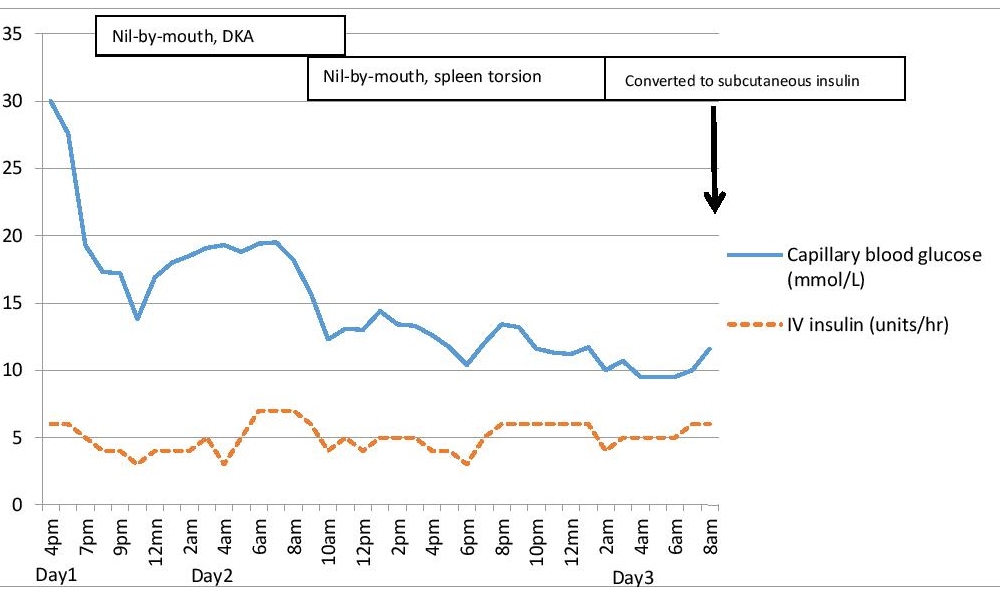 At the point of examination, her abdominal pain had improved and therefore the decision was to monitor her symptoms. Overnight, the ketonaemia resolved and capillary glucose was subsequently maintained at 6.3-11.3 mmol/L the following day (Figure 1).