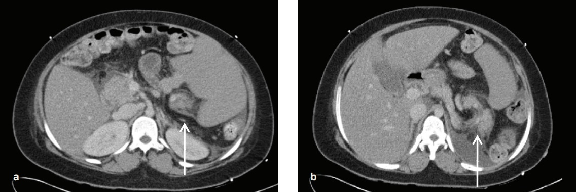 Click here to download Figure 2Figure 2. Torsion of patient's wandering enlarged spleen, with "whirling" of spleen (white arrow in picture A) and involving the pancreatic tail (white arrow in picture B).