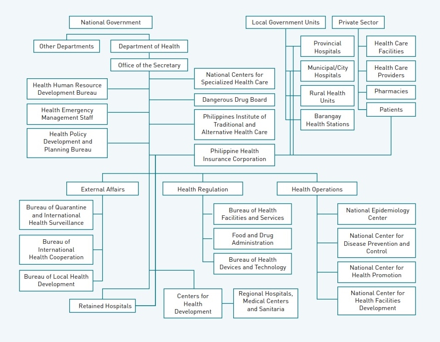A major share of the national expenditures on health, approximately 60%, goes to a large private sector that also employs over 70% of all health professionals in the country. The private sector consists of for-profit and non-profit providers, which are largely market-oriented. Healthcare is paid through user or professional fees at the point of service, or subsidized by official aid agencies or philanthropy. This sector provides services to an estimated 30% of the population who can mostly afford to pay these fees out of pocket. Although the private health sector is regulated by the DOH and the national health insurance system called the Philippine Health Insurance Corporation, health information generated by private providers is generally absent in the information system of the DOH.24 Organizational structure and accountability in the Philippine healthcare system is shown in Figure 1.