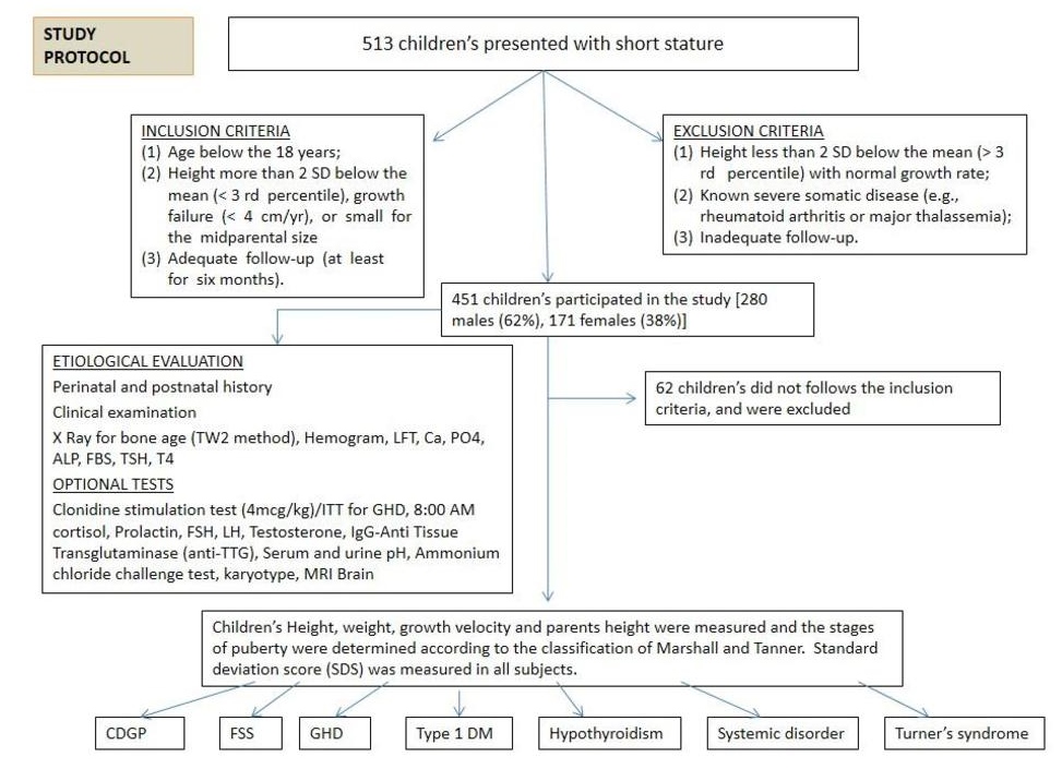A cross-sectional analytic study was carried out in the Department of Endocrinology at a tertiary care health center in north India from August 2012 to June 2015. The study was approved by the institutional ethics board and all patient-identifying information remains confidential. A total of 513 children with short stature were evaluated, 62 children did not follow the inclusion criteria so the remaining 451 children participated in the study. There were 280 males (62%) and 171 females (38%)] were identified as having short stature, with mean chronological age of 11.68±3.2 years. The study subjects were selected on the basis of the following inclusion criteria: (1) age below 18 years; (2) height more than 2 SD below the mean (<3rd percentile), growth velocity (<4 cm/yr), or small for the midparental size; and (3) adequate follow-up (at least for six months). The exclusion criteria were: (1) height less than 2 SD below the mean (>3rd percentile) with normal growth rate; (2) known severe somatic disease (e.g., rheumatoid arthritis or major thalassemia); and (3) inadequate follow-up. The study protocol is shown in Figure 1.