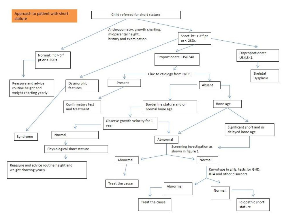 Thus, from the clinical point of view, some points to remember: (1) The most common causes of short stature are physiological rather than pathologic (2) Determination of height velocity is the most critical factor in evaluating the growth of a child; therefore careful anthropometric measurements (height and weight) need to be made, recorded and plotted accurately on growth chart and decision-making should be based upon careful observations of growth and calculations of growth rate at an interval of not less than 6 months or preferably 12 months. (3) Treatment for the short stature would be effective only before epiphyseal fusion.