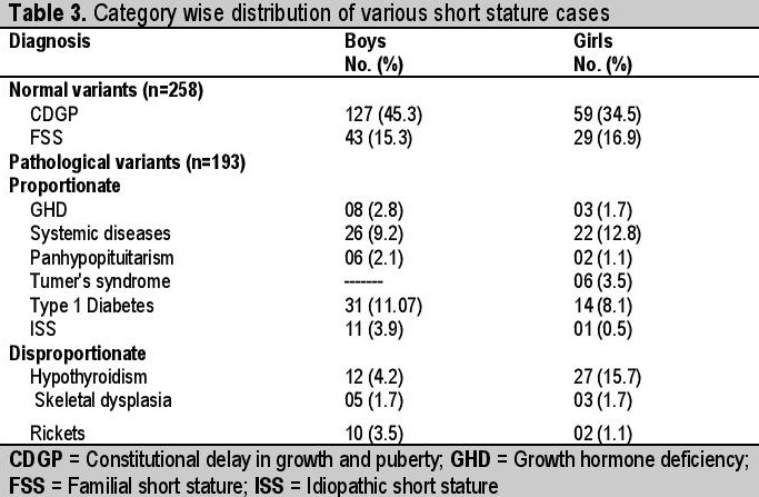 Methodology. A cross-sectional study was carried out in the Department of Endocrinology at a tertiary care health center in north India from August 2012 to June 2015. Four hundred and fifty one children (280 boys and 171 girls), ranging from 4 to 18 years presenting with short stature were studied. Anthropometric measurements were plotted on Indian standard growth charts.