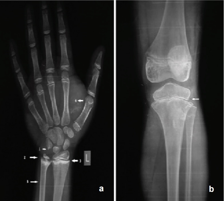 Click here to download Figure 4Figure 4a. X ray wrist showing bone age of 10 years (chronological age 16 years) 1. Epiphysis of pisiform just appearing 2. Irregular ossification of growth plate 3. Sclerotic band at radial metaphysis 4. Soft tissue thickening 5. Pencil thin cortex; Figure 4b. X ray of the knee showing heterogeneous epiphysis with irregular ossification of growth plate.
