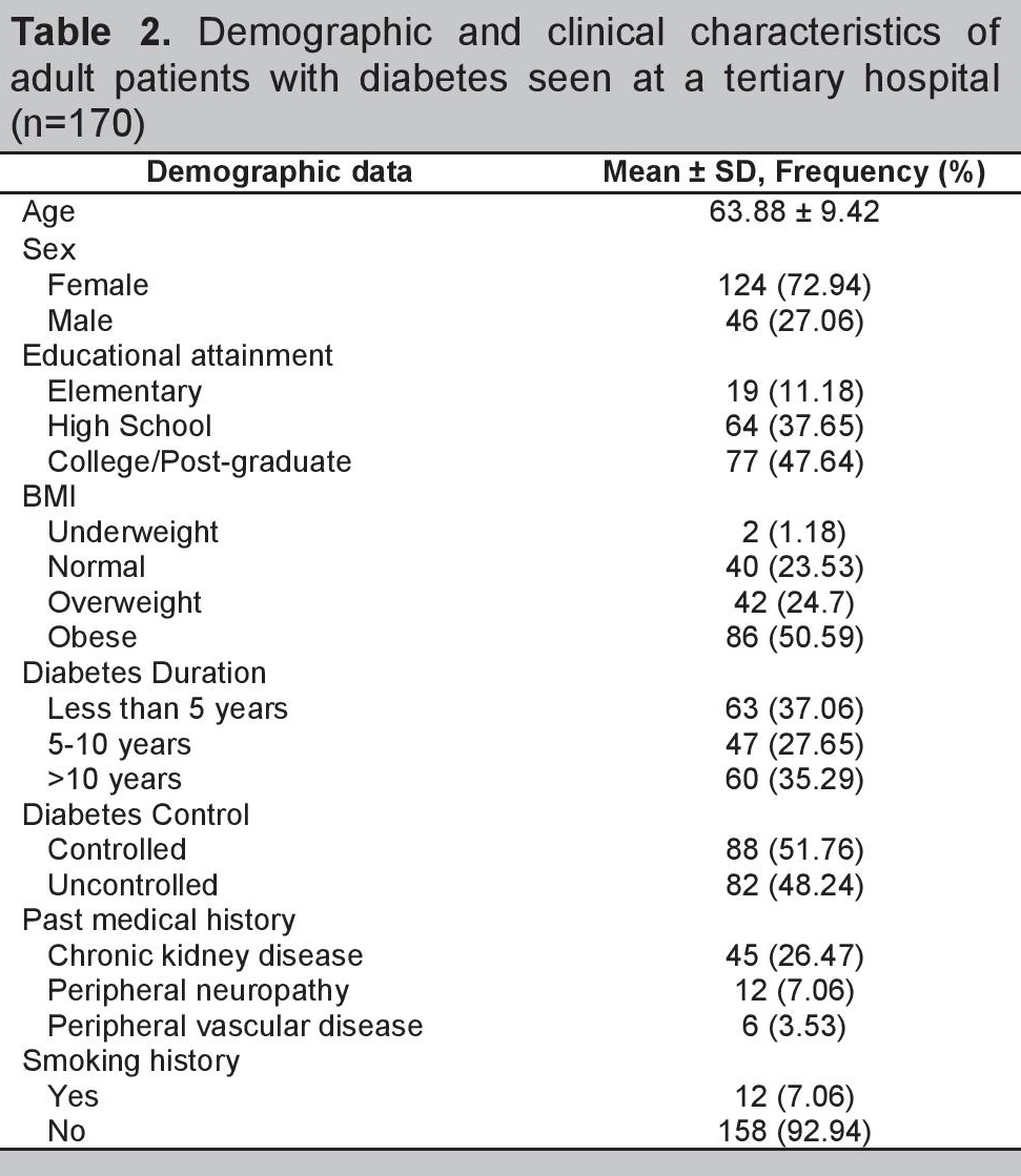 The total number of participants was 170, with a mean age of 64 years old, mostly females (72.94%), majority (88.82%) residing in Metro Manila. Nearly half (47%) were able to obtain college level education. Half the patients (50.59%) were obese based on the Body Mass Index Asia Pacific Classification. The duration of diabetes in 37.06% of the population was less than 5 years. Majority (81%) used oral hypoglycemic agents with half (51.76%) of them having good control of disease.