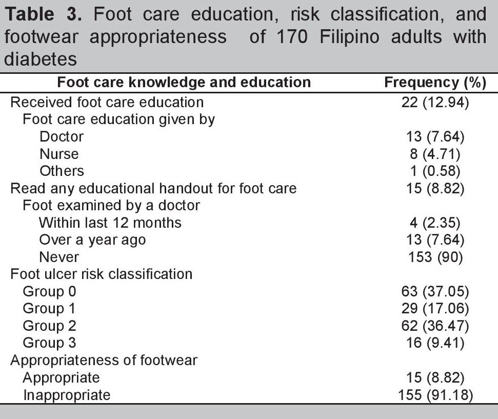 Click here to download Table 3Table 3. Foot care education, risk classification, and footwear appropriateness of 170 Filipino adults with diabetes