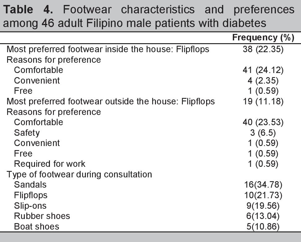 Click here to download Table 4Table 4. Footwear characteristics and preferences among 46 adult Filipino male patients with diabetes