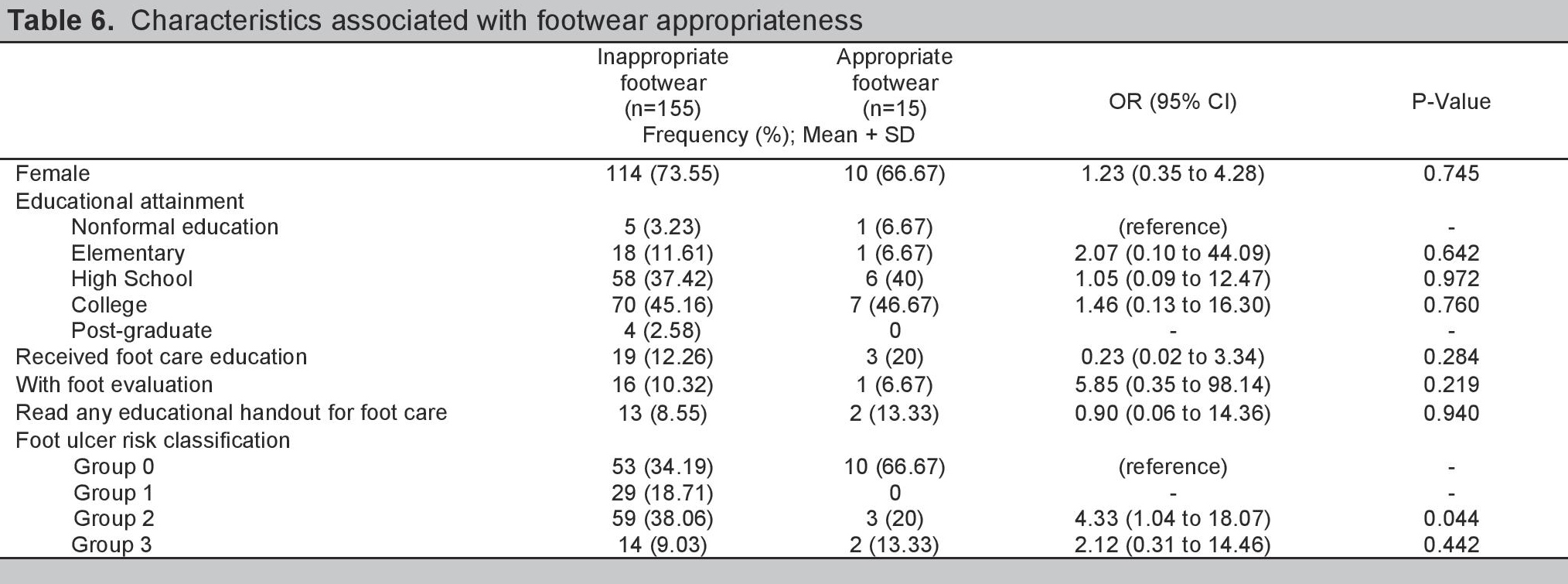 Click here to download Table 6Table 6. Characteristics associated with footwear appropriateness