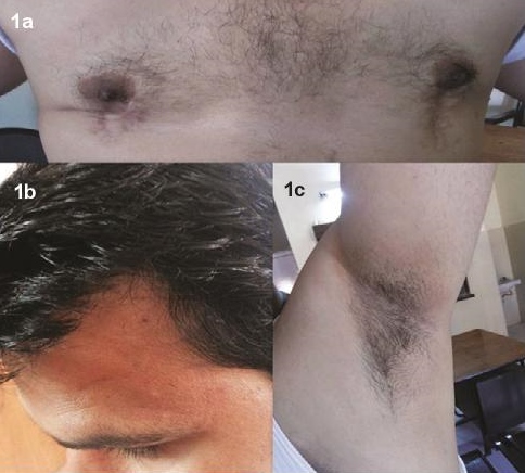 CASEA 25-year-old Indian man, nonsmoker, occasional alcoholic beverage drinker, vegetarian by diet, married for the last 2 years, presented to Endocrine OPD with complaint of inability to father a child. He had history of bilateral mastectomy a year back for gynaecomastia (Figure 1a). There were no previous records available about the work up of gynaecomastia. According to the patient, he underwent mastectomy for cosmetic purposes after his marriage. He was born as a result of nonconsanguineous marriage by full term normal vaginal delivery and cried immediately after birth. His developmental milestones were normal according to age. His height was 170 cm, weight 85 kg (BMI-29.4 kg/m2) and arm span 173 cm. His facial, axillary and pubic hair were normal in density and distribution (Figures 1b, 1c). The stretched penile length was 7 cm and testicular volume was 3 ml each (Figure 2). Respiratory, CVS, CNS, and abdominal examinations were normal.