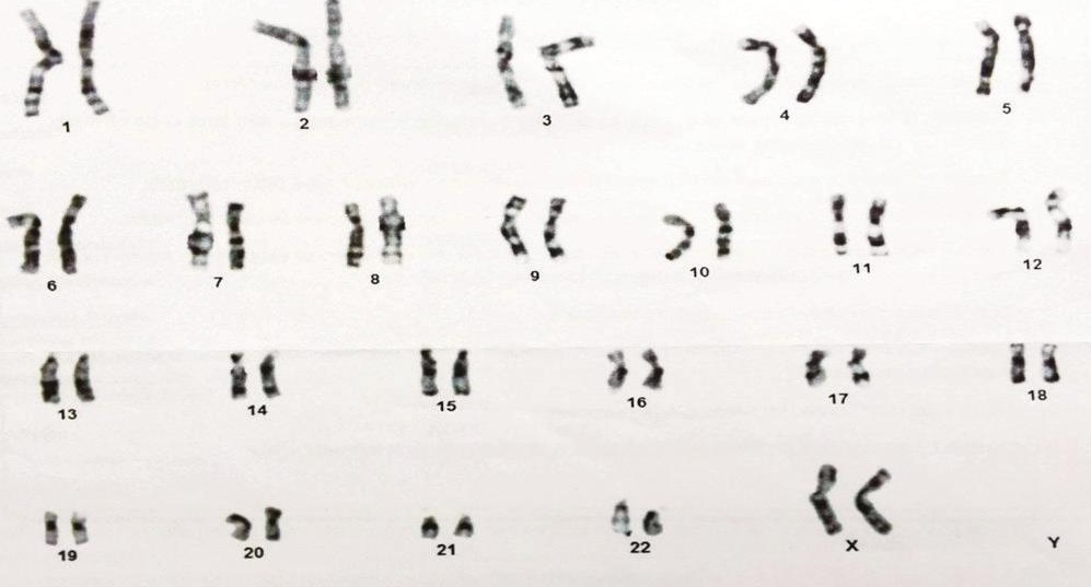 Ultrasonography and CT abdomen were normal and failed to find the uterus and adnexa. Azoospermia was reported on seminal fluid analysis. Serum luteinizing hormone (LH) and follicle stimulating hormone (FSH) were at 10.16 and 13.69 mIU/ml respectively (normal 2– 9.6 mIU/ml and 1.2–5.0 mIU/ml respectively). Serum testosterone concentration was 180.32 ng/dl (normal ranges are 270–1070 ng/dl), serum prolactin concentration was 6.32 ng/ml (normal ranges are 2.5– 17 ng/ml). Karyotyping revealed a female pattern i.e., 46,XX (Figure 3). Fluorescent in situ hybridization (FISH) to determine presence of SRY gene on X chromosome of patient was planned but patient could not get it done due to financial constraints.