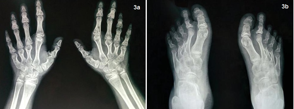 Figure 3.X-ray both hands and feet showing short 3rd, 4th and 5th metacarpals; 3b. Metatarsals in both limbs with positive Archibald sign.