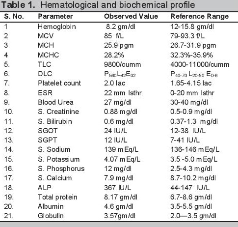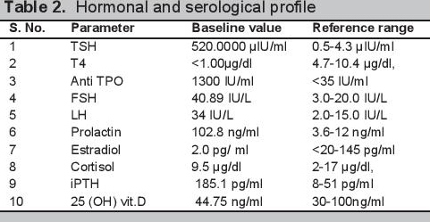 After 2 months of therapy, the patient showed significant clinical and biochemical improvement. On follow up visit after 2 month, her hemoglobin was 11.2 gm/dl. Her thyroid functions were improved with TSH 6.4329 μIU/m and T4 5.85 μg/dl along with normalization of serum prolactin (S. Prolactin: 5.5 ng/ml). The patient became normocalcemic and normophosphatemic with serum calcium 9.2 mg/dl and serum phosphorus 6.47 mg/dl and her parathormone level was 74.2 pg/ml.