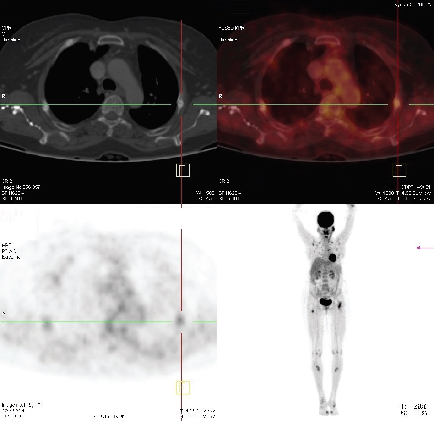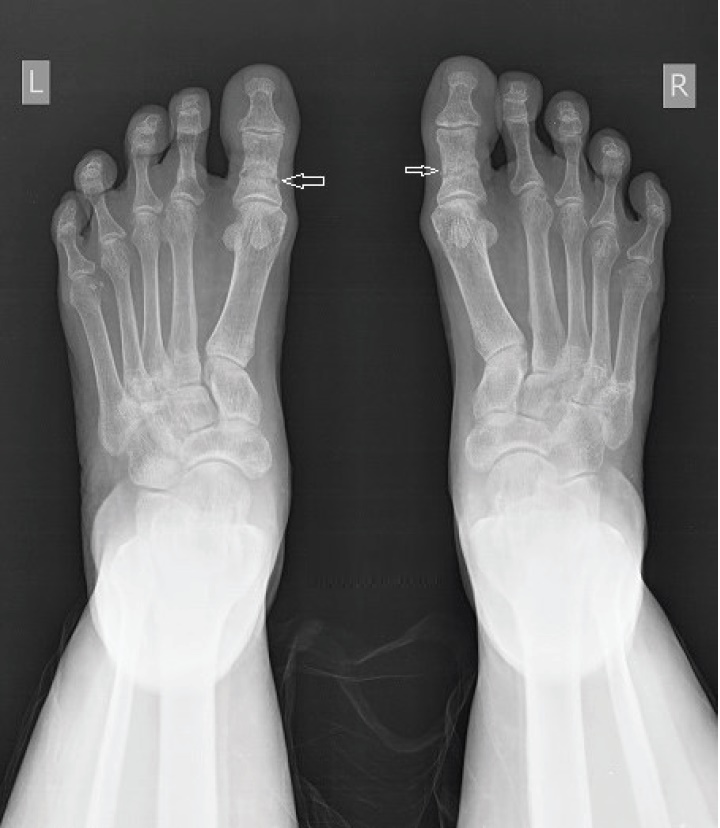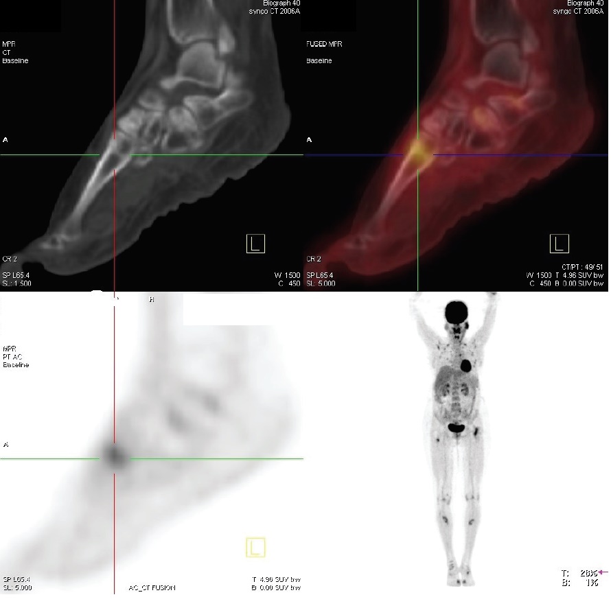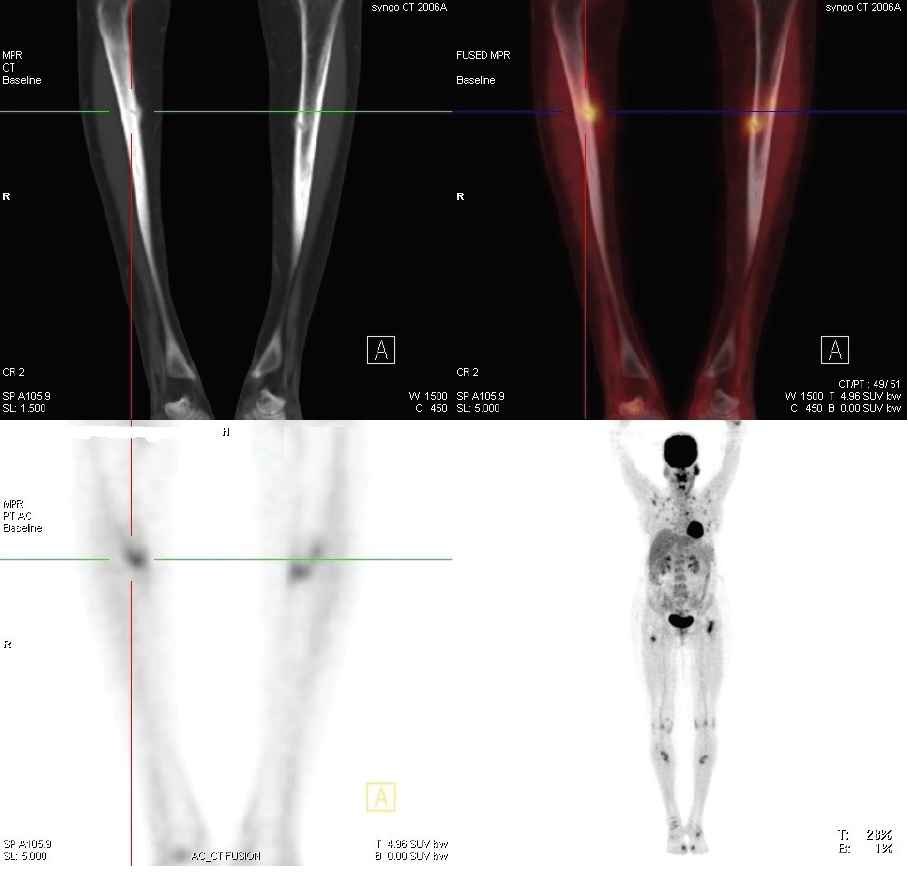 Radiological studies showed bilateral tibial shaft fractures, multiple fractures in bilateral tarsals (Figures 1 to 3). A PET Scan showed multiple insufficiency fractures of bilateral tibia, neck of right femur, metacarpal bones and scapula (Figures 4 to 7).