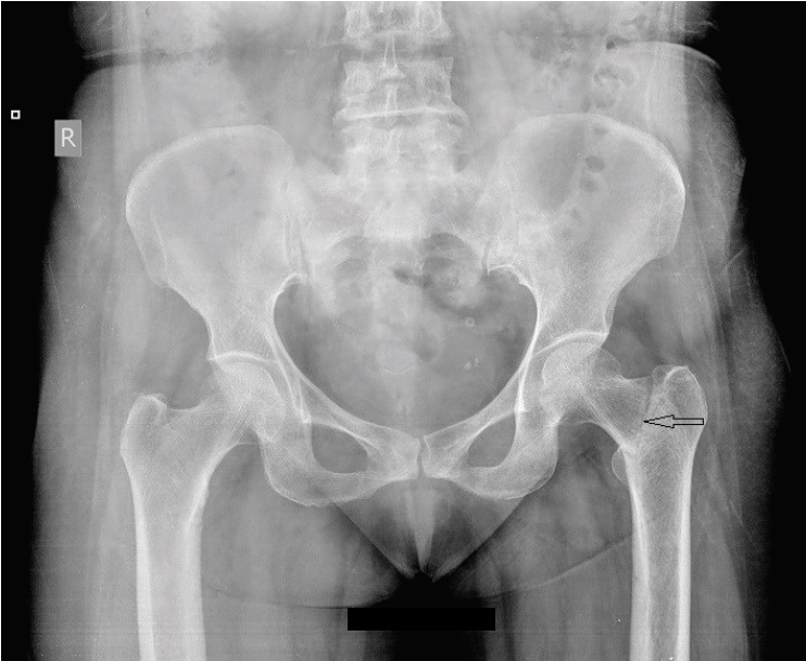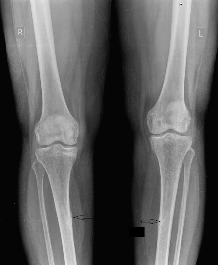 CASEA 57-year-old Indian woman, presented with the chief complaints of bilateral leg pains on walking since 15 months, limping to either side since 3 months and currently walking with support of a stick since 1 month. The patient also complained of pain in both upper limbs since 1 month. She had past history of Chikungunya infection 4 years ago and history of left superficial parotidectomy in 2011. Before coming to our OPD, she was treated for Rheumatoid Arthritis, evaluated for multiple myeloma and connective tissue disorder due to intense pain in lower limbs. She had received oral calcitriol before coming to hospital. However, the patient was not given phosphorous supplement. There was no family history of metabolic bone disease. There was no history of loss of weight, decreased appetite, and swelling or mass anywhere in the body except a left parotid enlargement.