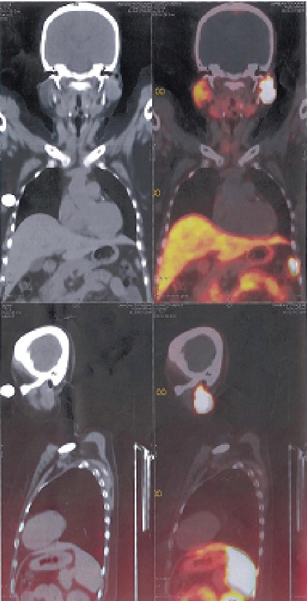 Click here to download Figure 8Figure 8.(68)Ga-DOTATE scan showing coronal and sagittal view of mass in left parotid.