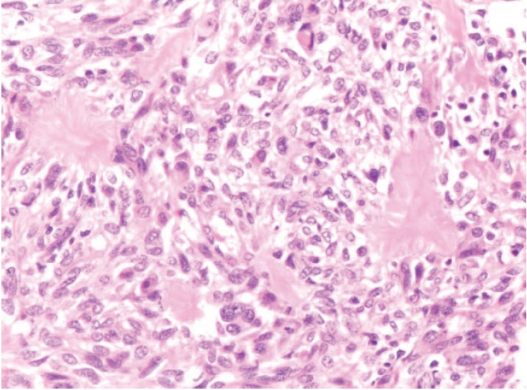 Figure 10.High power view of the tumour showing increased cellularity and mild nuclear pleomorphism. However, the mitotic activity is low (40x).