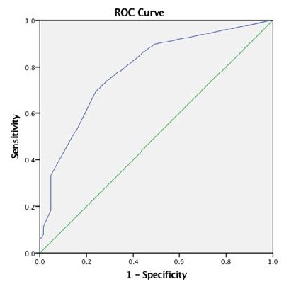 Analysis was also done on different cut-off scores to determine the most accurate cut-off for the study population. Receiver operating characteristic (ROC) curves was used to illustrate the relationship between the true positive ratio (sensitivity) and the false positive ratio (1- specificity) of a test. Areas under the receiver operating characteristic curve (AUC) are a measure of the performance of a test in predicting the outcome of interest. An AUC value of 0.5 indicates that a test performs no better than chance. AUC values between 0.70 and 0.79 indicate fair test performance, values between 0.80 and 0.89 indicate good performance and values ≥0.9 indicate excellent performance.