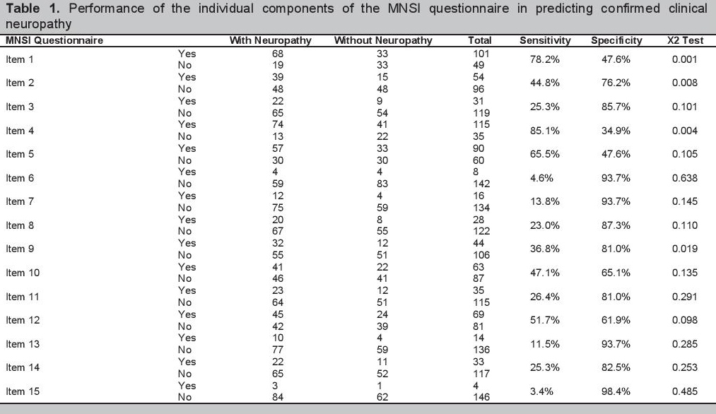 Click here to download Table 1Table 1.Performance of the individual components of the MNSI questionnaire in predicting confirmed clinical neuropathy