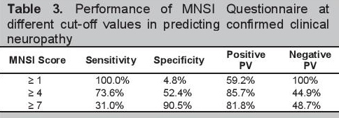 Table 3. Performance of MNSI Questionnaire at different cut-off values in predicting confirmed clinical neuropathy