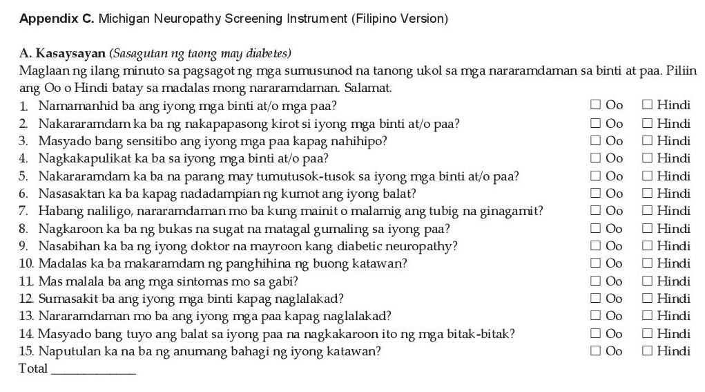 Click here to download Appendix CAppendix C. Michigan Neuropathy Screening Instrument (Filipino Version)