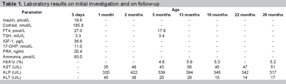 The parents were educated on the identification and treatment of hypoglycemia. They were advised to perform home monitoring and recording of capillary blood sugar 3 to 4 times a day. During episodes of hypoglycemia, the boy was observed to be pale and inactive. His mother would then treat him with milk. In the first 1 year of life, he had hypoglycemia about 3 to 4 times a week, particularly if he took very little milk or refused to eat. The episodes of hypoglycemia occurred less as he grew older, with a frequency of 2 to 3 episodes in a month.